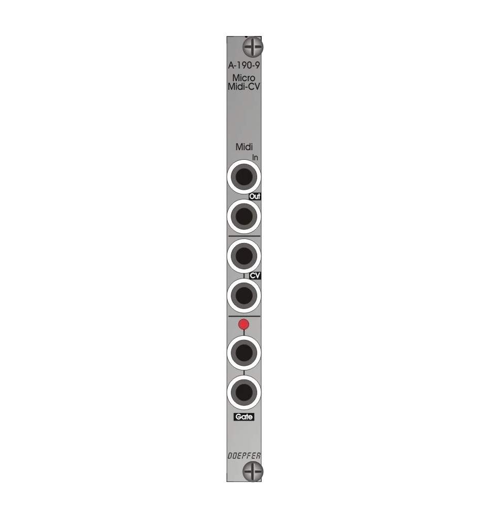 Module A-190-9 is a simple Midi-to-CV/Gate interface. It is planned for applications where the more sophisticated functions of the other midi interfaces of the A-190-x series are not required.
