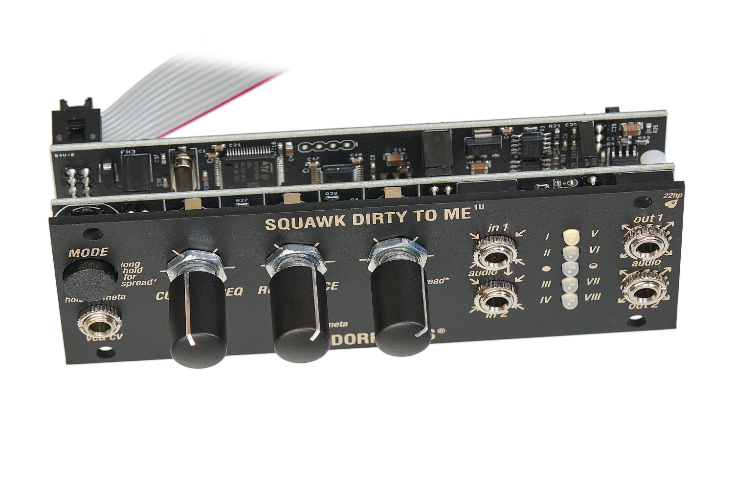The Squawk Dirty To Me 1U is a stereo filter with voltage-controlled resonance. It features 8 filter modes and zero-delay feedback.