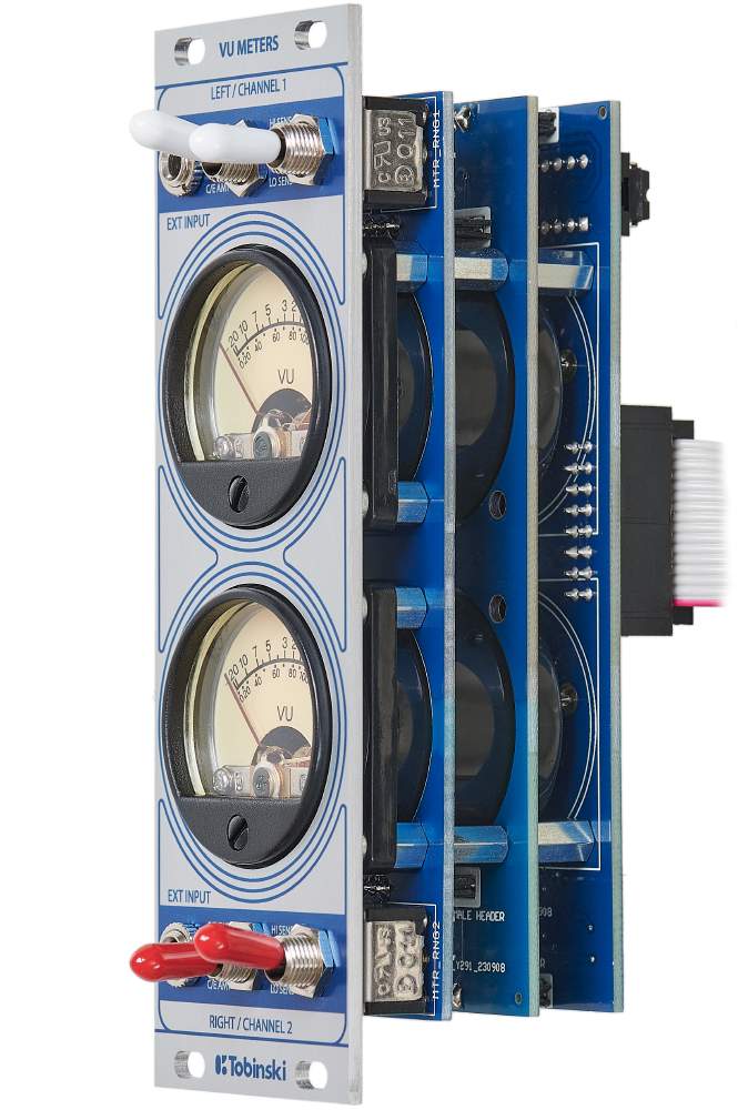 The Tobinski VU Meters is designed to be used with 2 x Dynamics modules. The modules connect internally via 2x3 pin ribbon cables. The meters provide a visual representation of various signals within the Dynamics modules making settings easier.