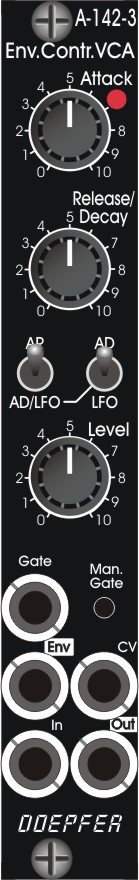 Module A-142-3 is also available in a vintage edition, which is a single version of 142-2. It combines a VCA and an AD/AR envelope generator that can also work as an LFO, and is housed behind a 4 HP front panel.