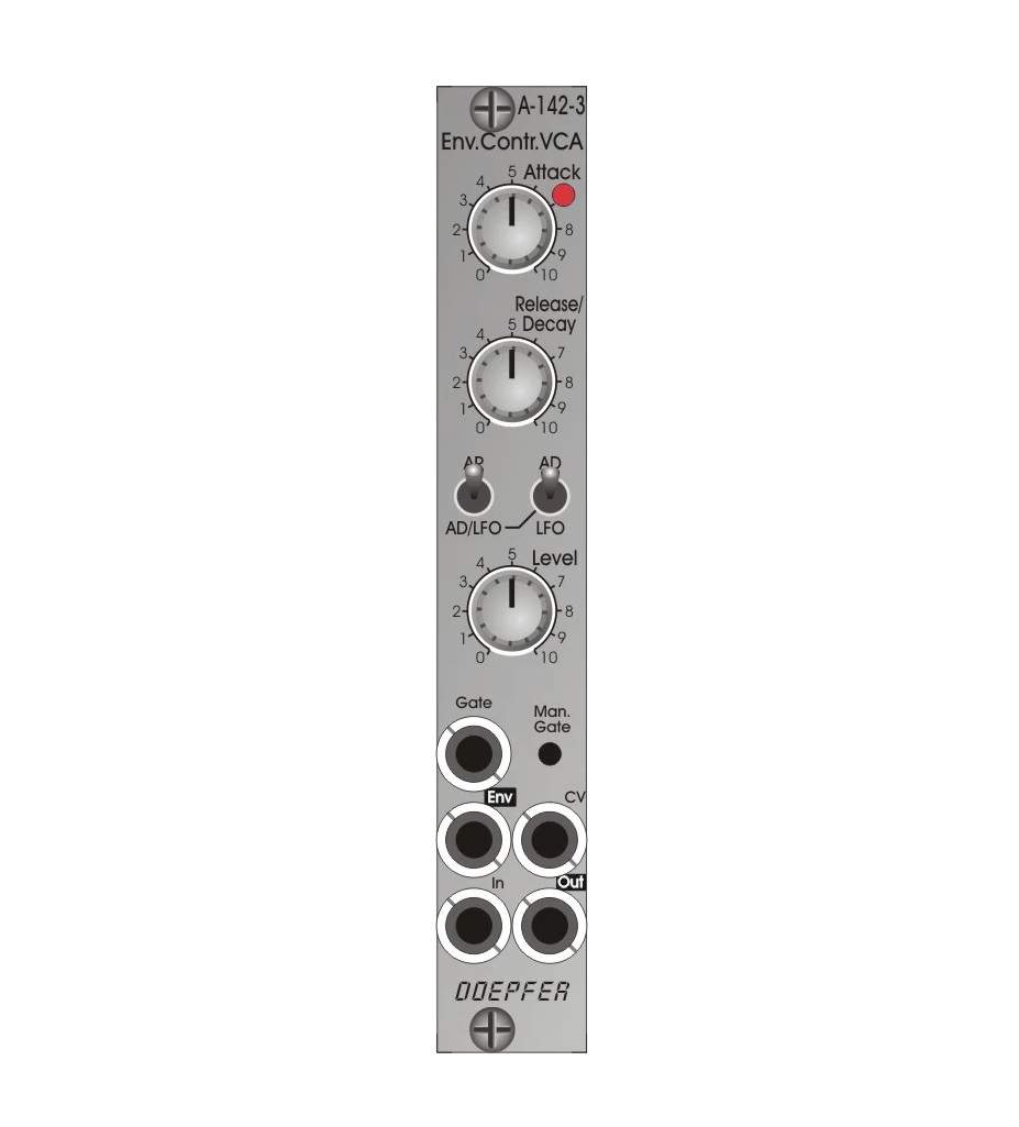The A-142-3 module is the single version of the 142-2. It combines a VCA with an AD/AR envelope generator that can also function as an LFO.