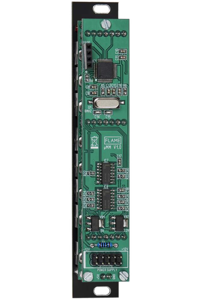 The "uMM" combines a MIDI merger and two independent THRU distributors in a module that is only 4 HP wide. All sockets on the module are in MIDI TRS-B format.