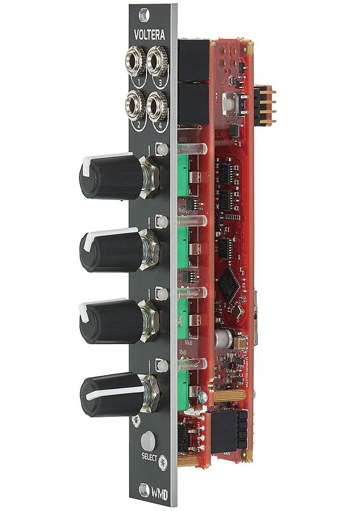 Voltera is an expander for the Metron trigger and gate sequencer, adding 4 bipolar voltage tracks. Up to 16 Volteras can be connected to a Metron, providing up to 64 CV outputs.