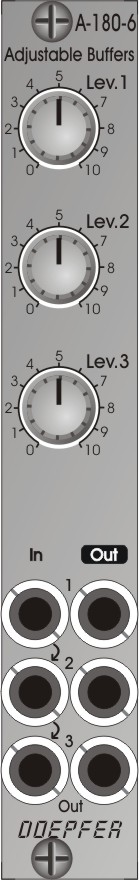 The A-180-6 module is a triple buffer module in which the gain of each unit can be adjusted separately.