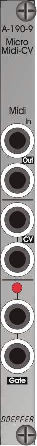 Module A-190-9 is a simple Midi-to-CV/Gate interface. It is planned for applications where the more sophisticated functions of the other midi interfaces of the A-190-x series are not required.