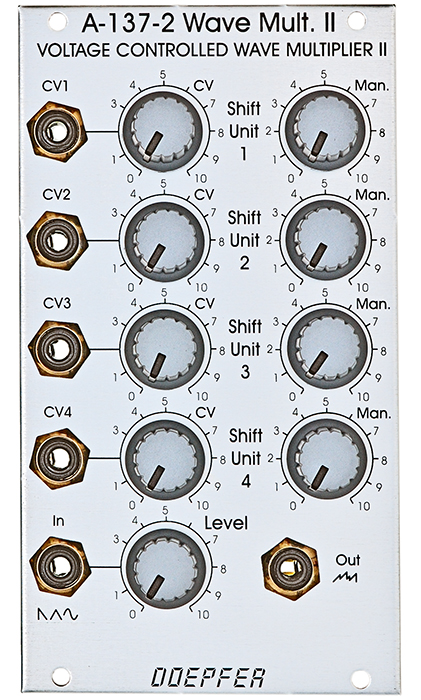 Module A-137-2 is another version of a wave multiplier. In contrast to the A-137-1 Wavemultiplier I the A-137-2 generates four phase-shifted copies of a VCO signal applied to the audio input. The four shifted signals are added to the original signal to obtain a fat sound similar to five independent VCOs. The phase shifting is made by a simple circuit that works only for sloped signals like sawtooth, triangle or sine, but not for rectangles or pulses