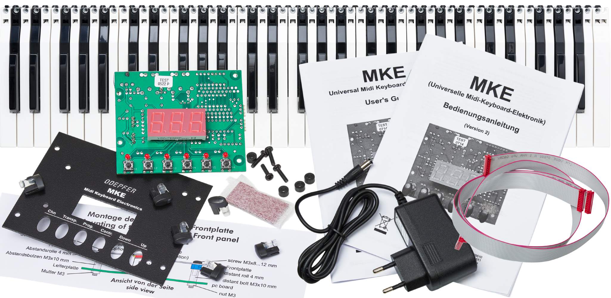 MKE package consisting of MKE electronic kit, front panel kit, keybed 61TP/8O, cable set and power supply.